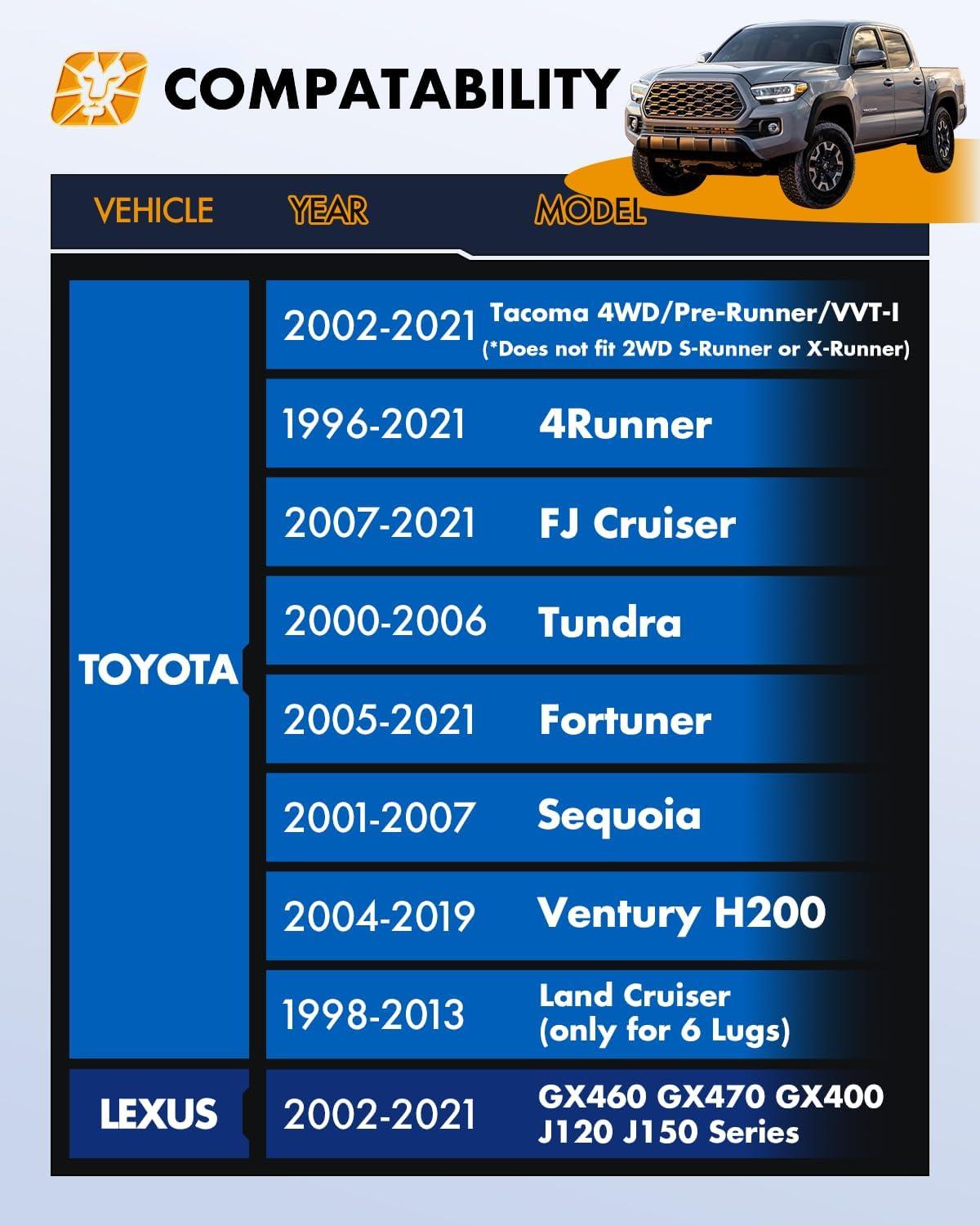 【Compatibility with Toyota】2002-2021 Tacoma 4WD/Pre-Runner/VVT-I (*Does not fit 2WD S-Runner or X-Runner), 1996-2021 4Runner, 2000-2006 Tundra, 2005-2021 Fortuner, 2001-2007 Sequoia, 2004-2019 Ventury H200, 2007-2021 FJ Cruiser, 1998-2013 Land Cruiser(only for 6 Lugs)