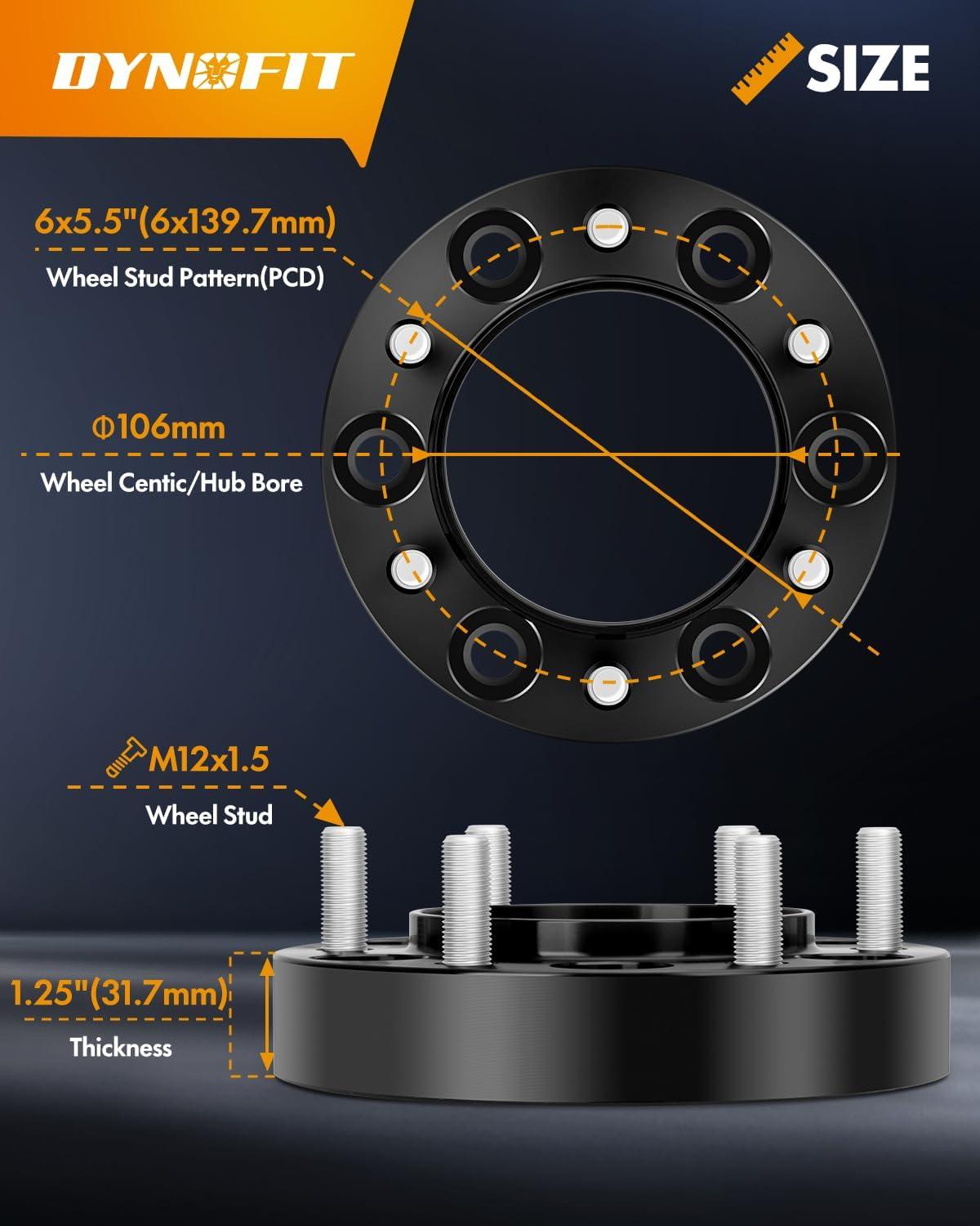 dynofit 1.25" 6x5.5 Wheel Spacers for Toyoya Tacoma, 4Runner, Tundra, FJ Cruiser, 6x139.7 Forged Spacers M12x1.5 Studs 106mm Hub Centric 1.25" Thick with Extended Lug Nuts for Lexus GX Series, 4Pcs