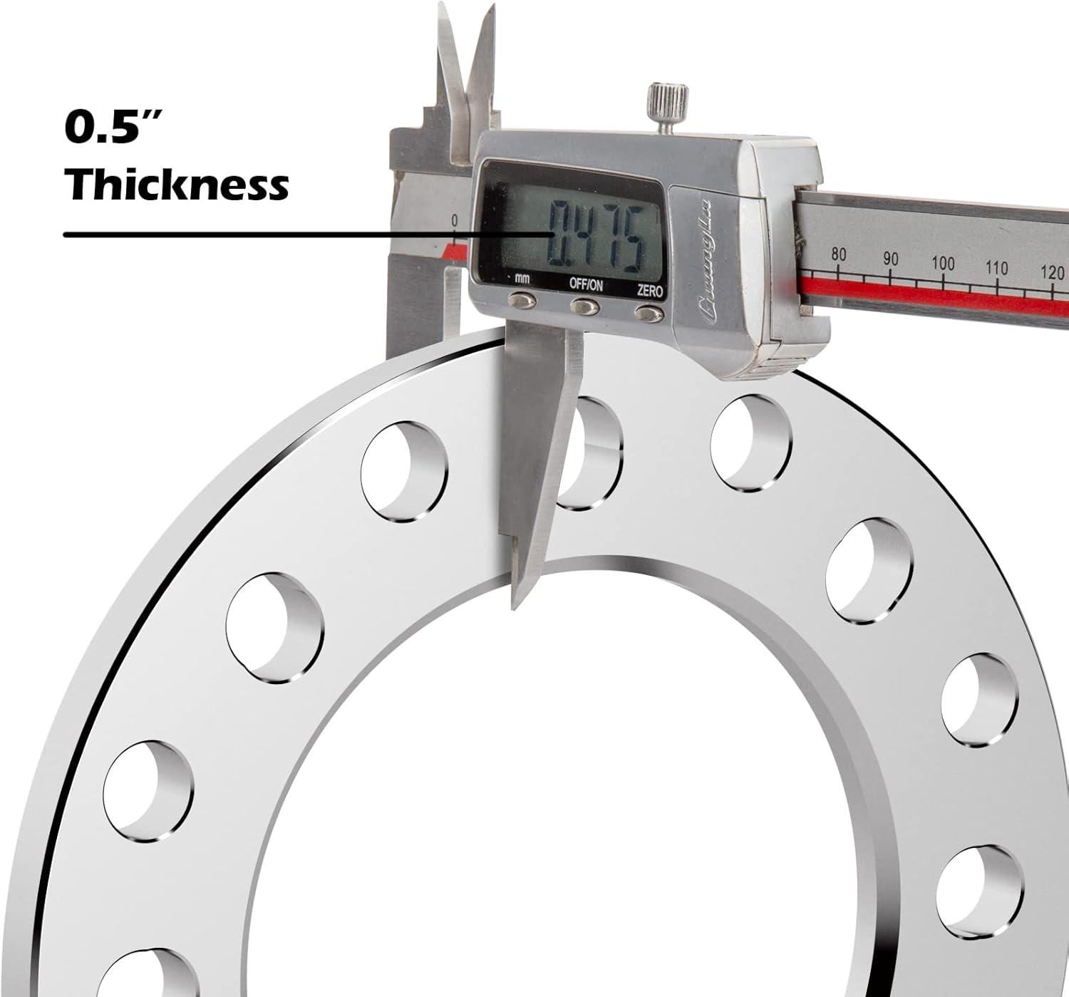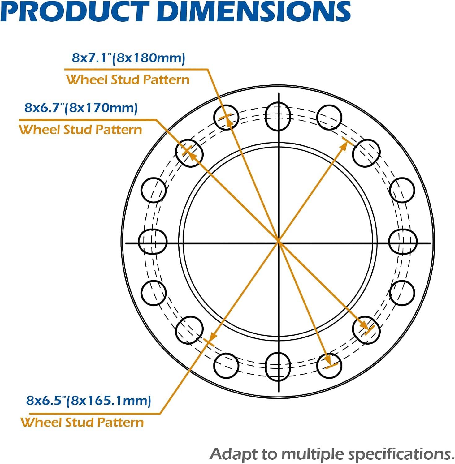 Specification: multi-bolts pattern(pcd)8 x 165.1(8 x 6.5), 8 x 170(8 x 6.7), 8 x 180(8 x 7.1), universal wheels spacer | hub bore:127mm(ID) works from 100-127mm center hole, 205mm(OD) |thickness: 12mm(about 1/2″), comes 4pcs and totally around 24mm wider front and rear