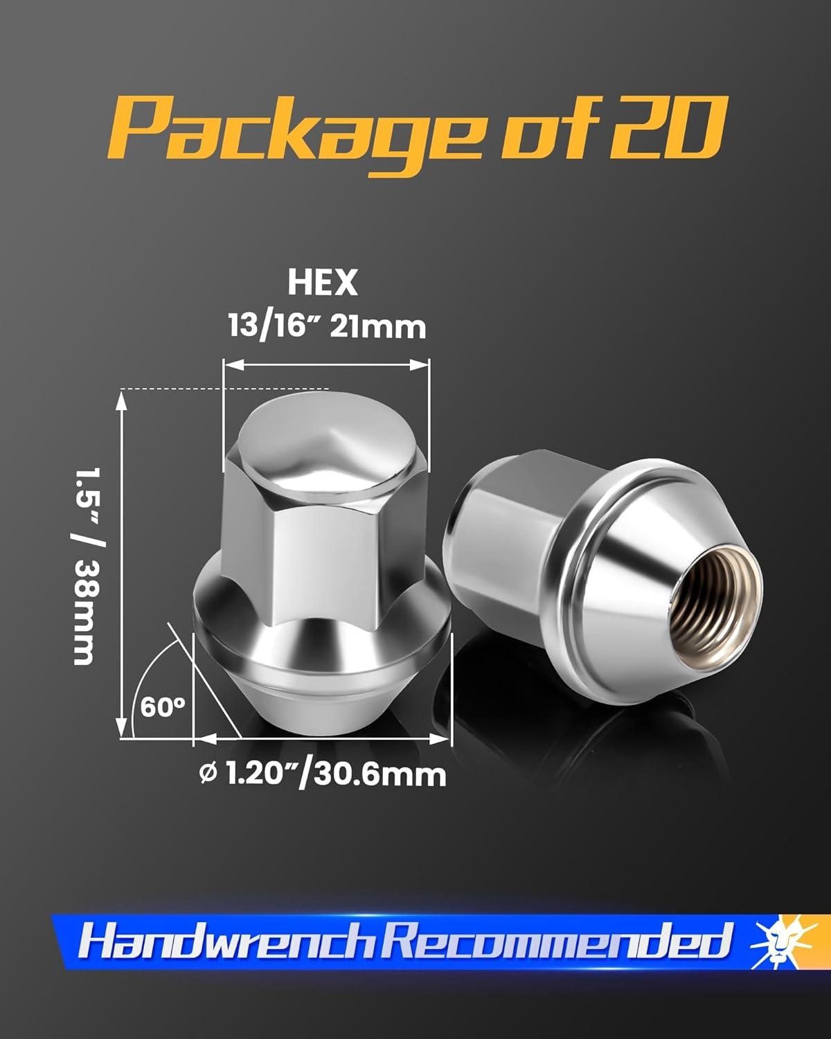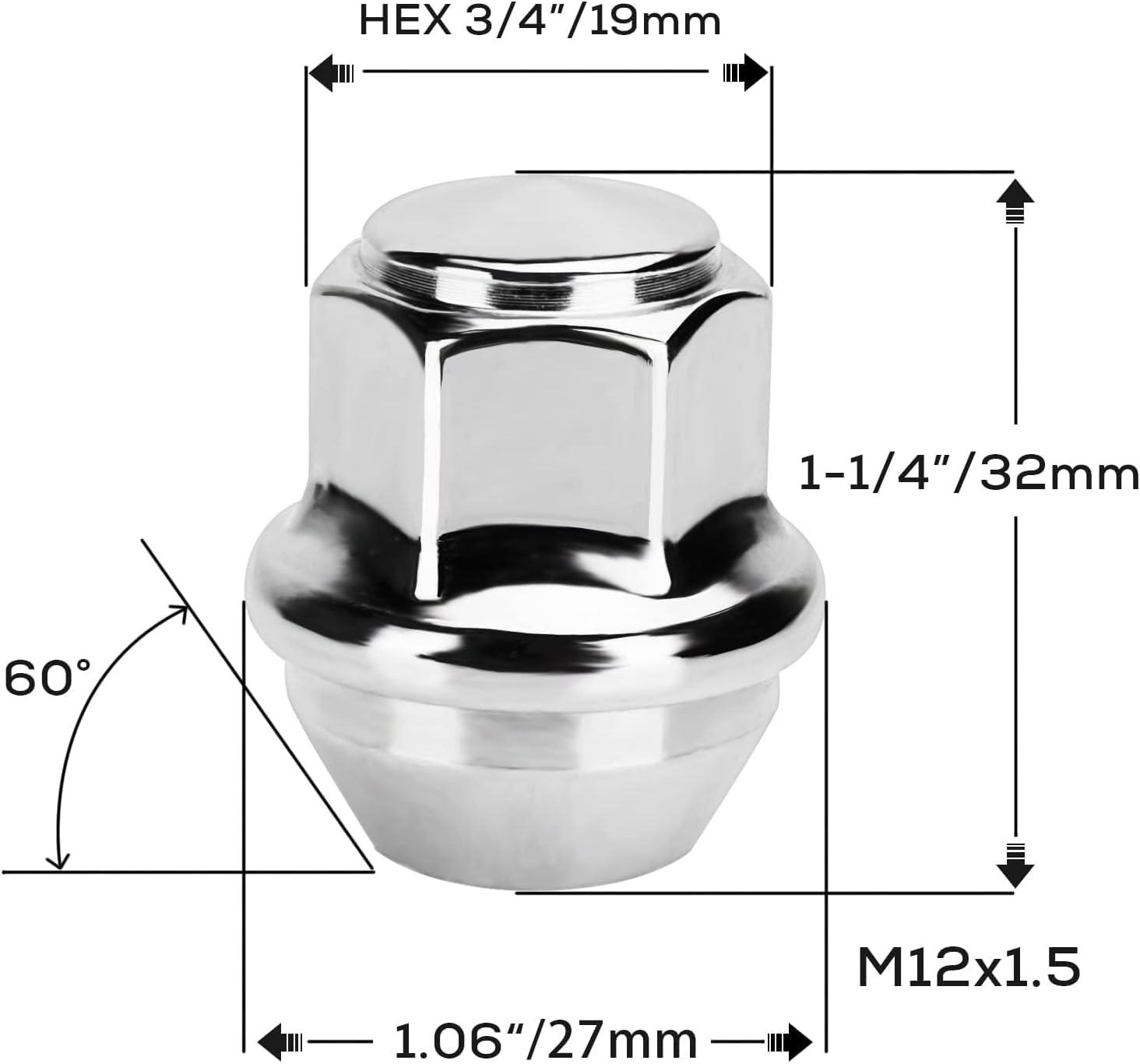 Specification: 19mm 3/4 Hex, 12mm x 1.50 thread pitch, conical/cone seat, 60 degree, 32mm 1.25″ length, 27mm width, silver color, 20 pack.