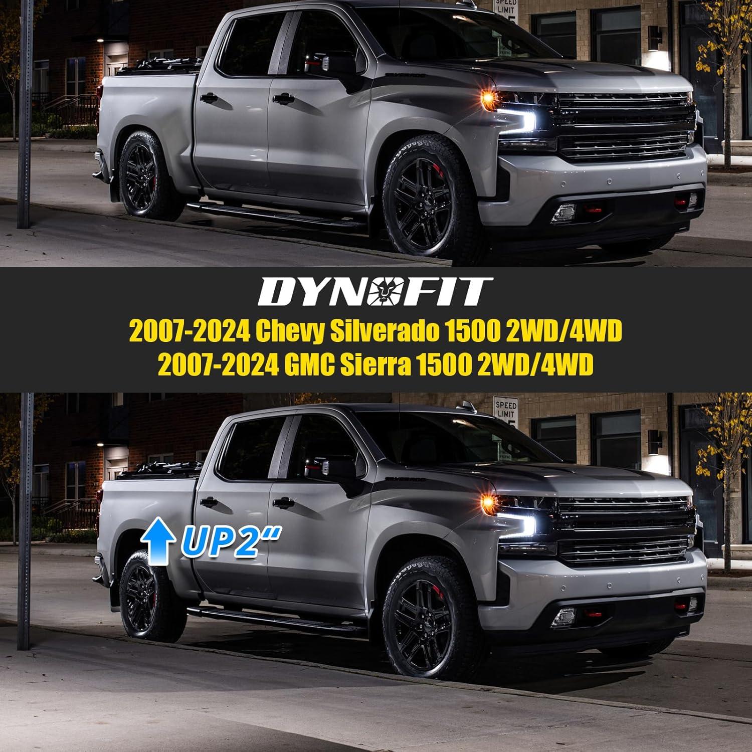 Dynofit Premium 2″+1″ Leveling Lift Kits Series Size: Front Strut Spacer Real thickness 1.25 inch appr. But true 2″ front spacer leveling lift kits because of suspension geometry. Rear Block Real thickness 2 inch appr, But true 1″ rear lift because of stock vechicles have a block lift 1″. Compatibility: 2007-2024 Silverado 1500 2WD/4WD 2007-2024 GMC Sierra 1500 2WD/4WD (New Body Style) with 6 lugs *Note: For 2019+ Silverado Sierra 1500, not fit “MONO-LEAF” leaf spring, AT4, TrailBoss Tips: Professional installation and alignment are recommended