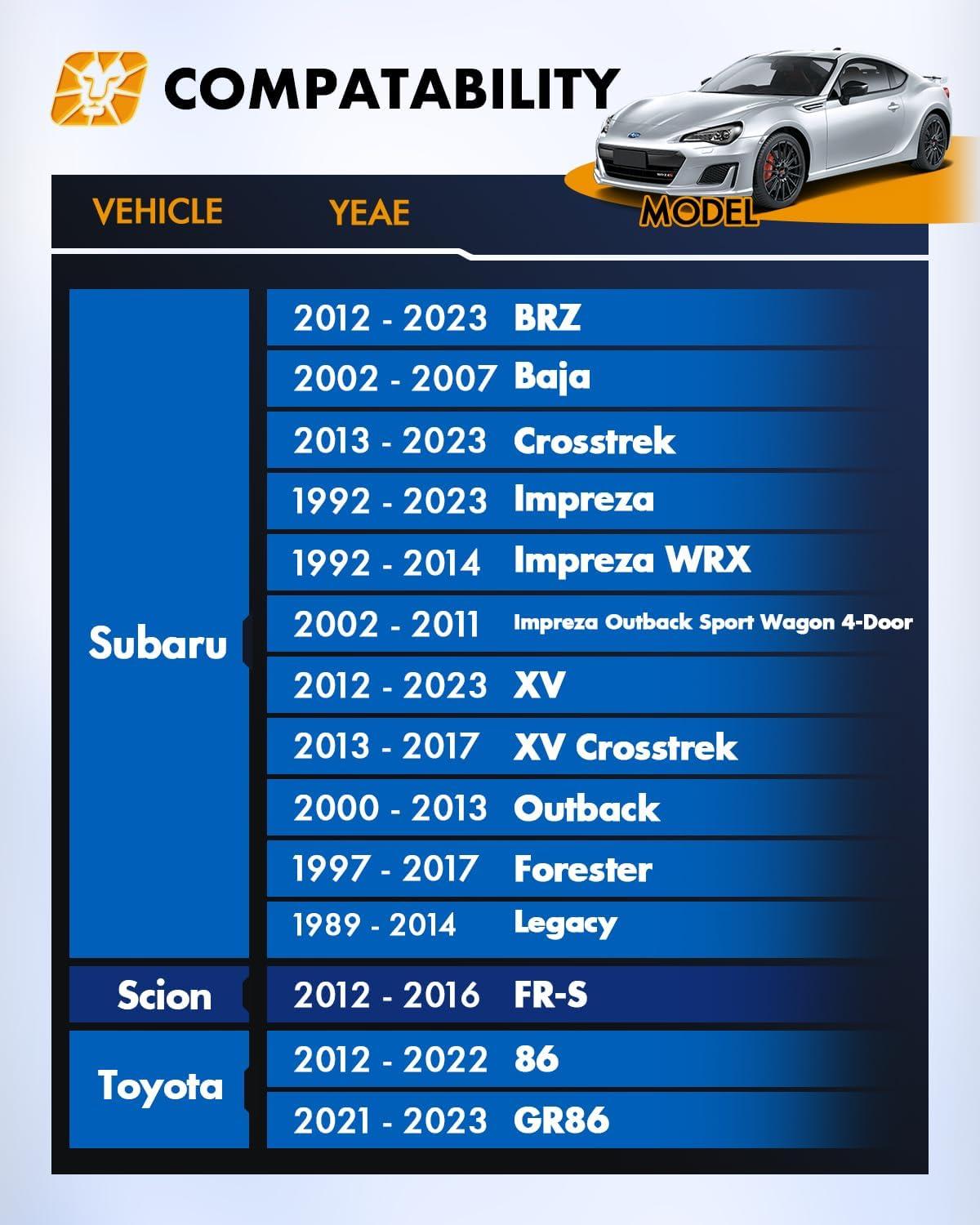 【Fitment】Compatible with 2012-2023 BRZ |2002-2007 Baja | 2013-2023 Crosstrek | 1992-2023 Impreza | 1992-2014 Impreza WRX | 2002-2011 Impreza Outback Sport Wagon 4-Door | 2012-2023 XV | 2013-2017 XV Crosstrek | 2000-2013 Outback | 1997-2017 Forester | 1989-2014 Legacy | 2012-2016 Scion FR-S | 2012-2022 Toyota 86 | 2021-2023 Toyota GR86