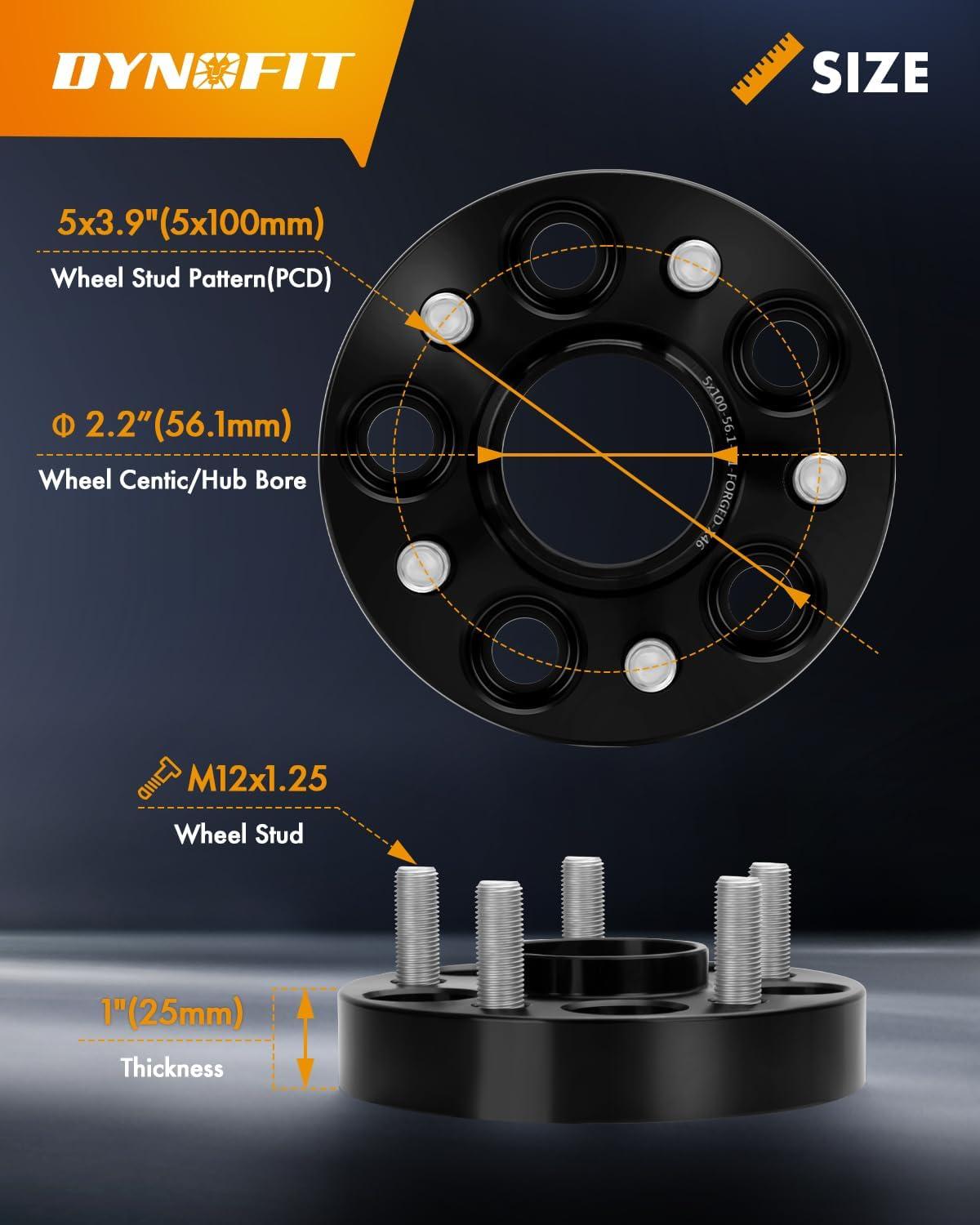 【Wheel Spacer Parameter】Wheel Pattern(PCD) = Vehicle Bolt Pattern = 5x100mm(5×3.94″) | Hub Bore: 56.1mm | Thread Pinch: M12x1.25 | Thickness: 1″(25mm) | Set of 4 Pcs.