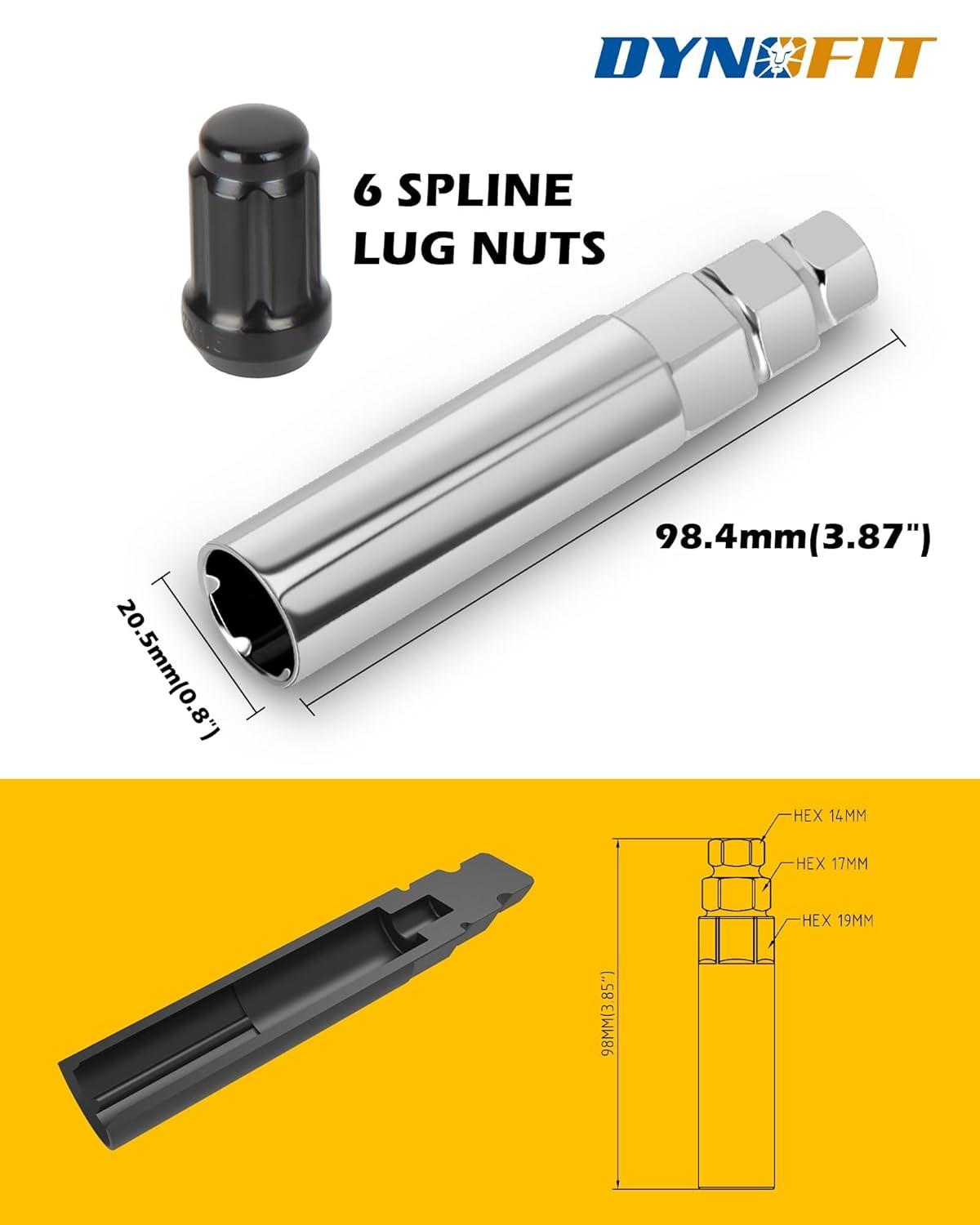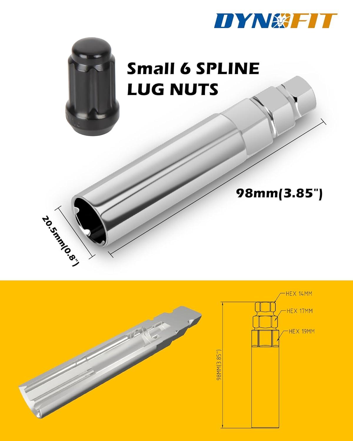 imageDynofit 6 Spline Lug Nuts Socket Key Universal Chrome Spike Key fit Hex 19mmampamp17mmampamp14mm Tool Wrench1PC Sleeve fit Thread M12X1512X12512quot2038quot2410mmx125 Small NutsBlack