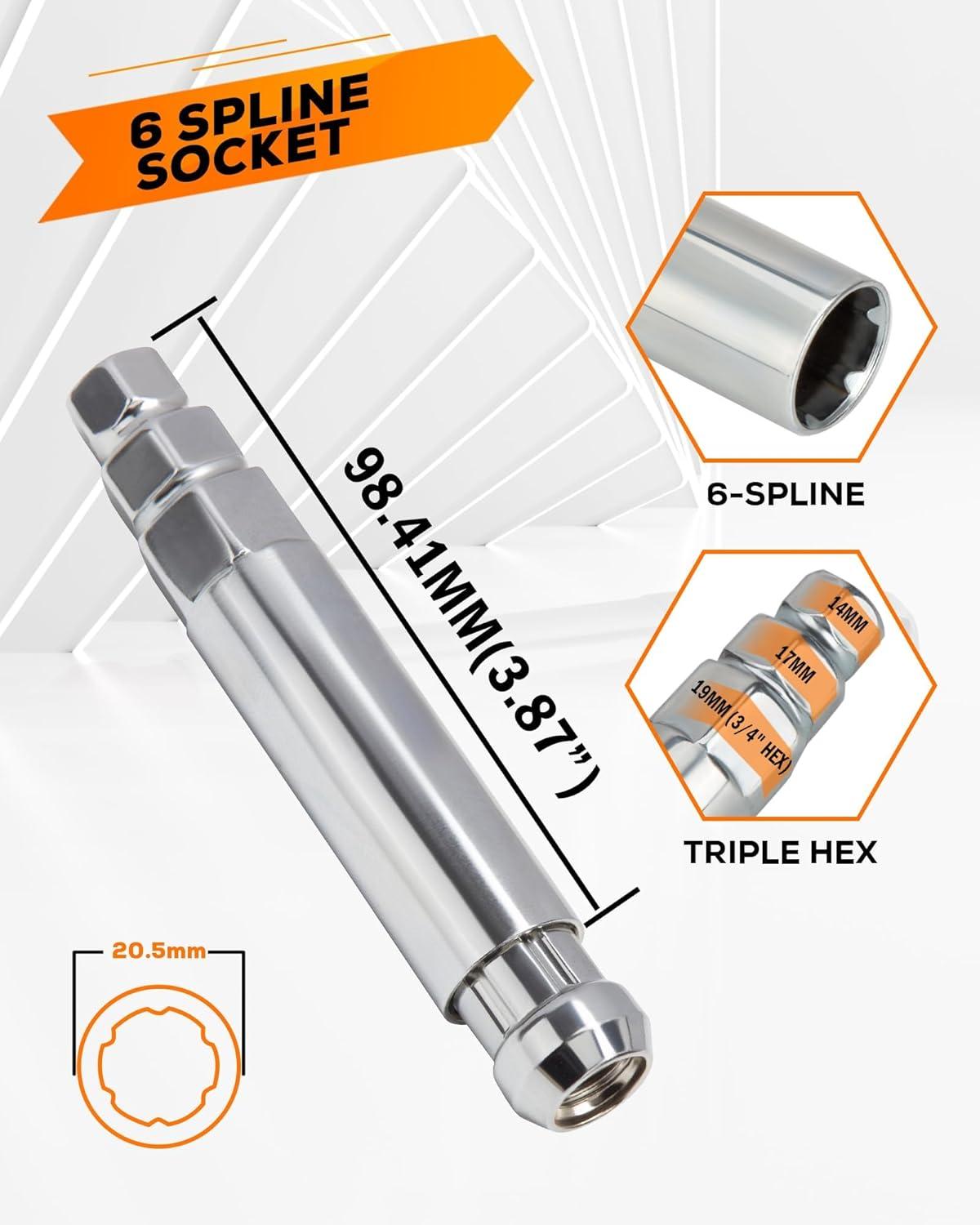 Specification: Length:98mm(3.87″);Hex:14mm/17mm/19mm;Can work on 6 spline lug nuts and 6 spline spike lug nuts(B0BR6TBW4M/B0BR6YL65B)