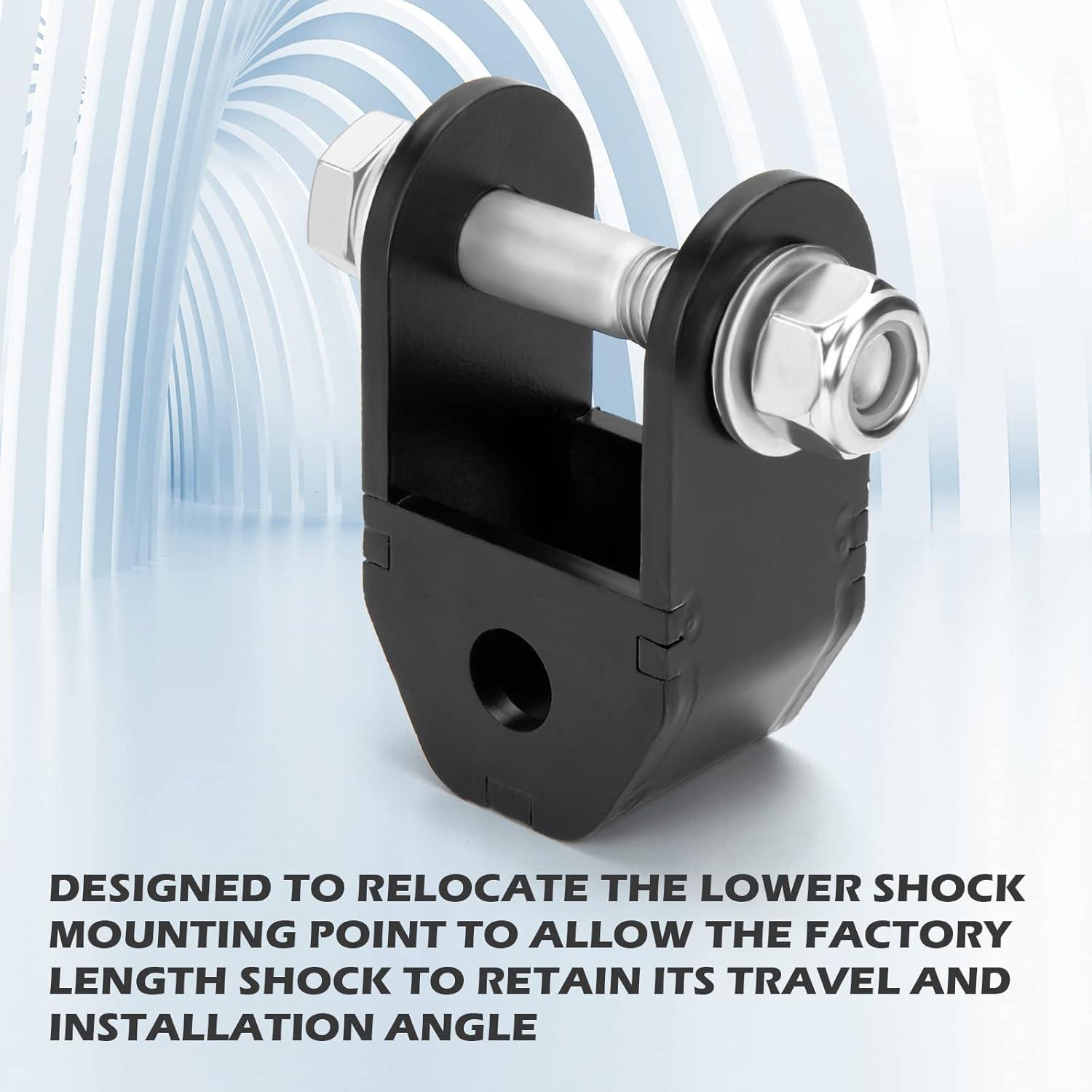 Performance: CNC machined steel, great compression strength. Durable finish block with 63.5mm width to keep enough safety contact with leaf springs, 10.9 grade bolts with 9/16 thread pitch and thicker washer. Our shock extensions are crafted from High-Tensile Strength Steel and finished with a Durable Black Powder Coat