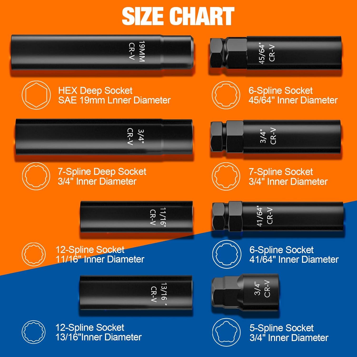 8-PIECE WHEEL LOCK KEY: Specification of 6PC common spline key, the inner sizes are (5-Spline 3/4'', 6-Spline 41/64'' & 45/64'', 7-Spline 3/4'', 12-Spline 11/16'' & 13/16''), 2PC deep socket set for spiked lug nut , the inner size are(SAE 19MM, 7-Spline 3/4'')