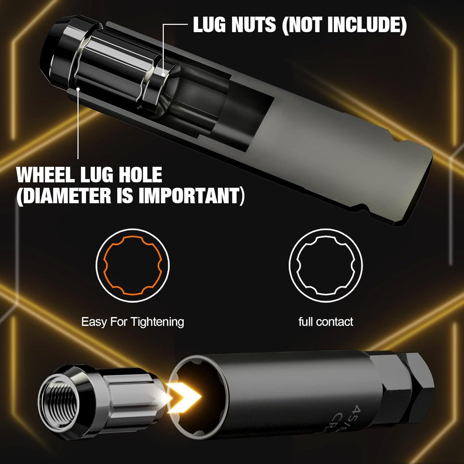 MULTI-FUNCTIONAL: The Dynofit Lock Lug Nut Key Kit is a master set of double hex-headed, tuner style keys can fit a variety of vehicles with aftermarket lug nuts (5, 6, 7 spline and Hex set). Besides, our upgrade 2.0 version set is equiped with a hex deep socket which would install spiked lug nuts when others can't