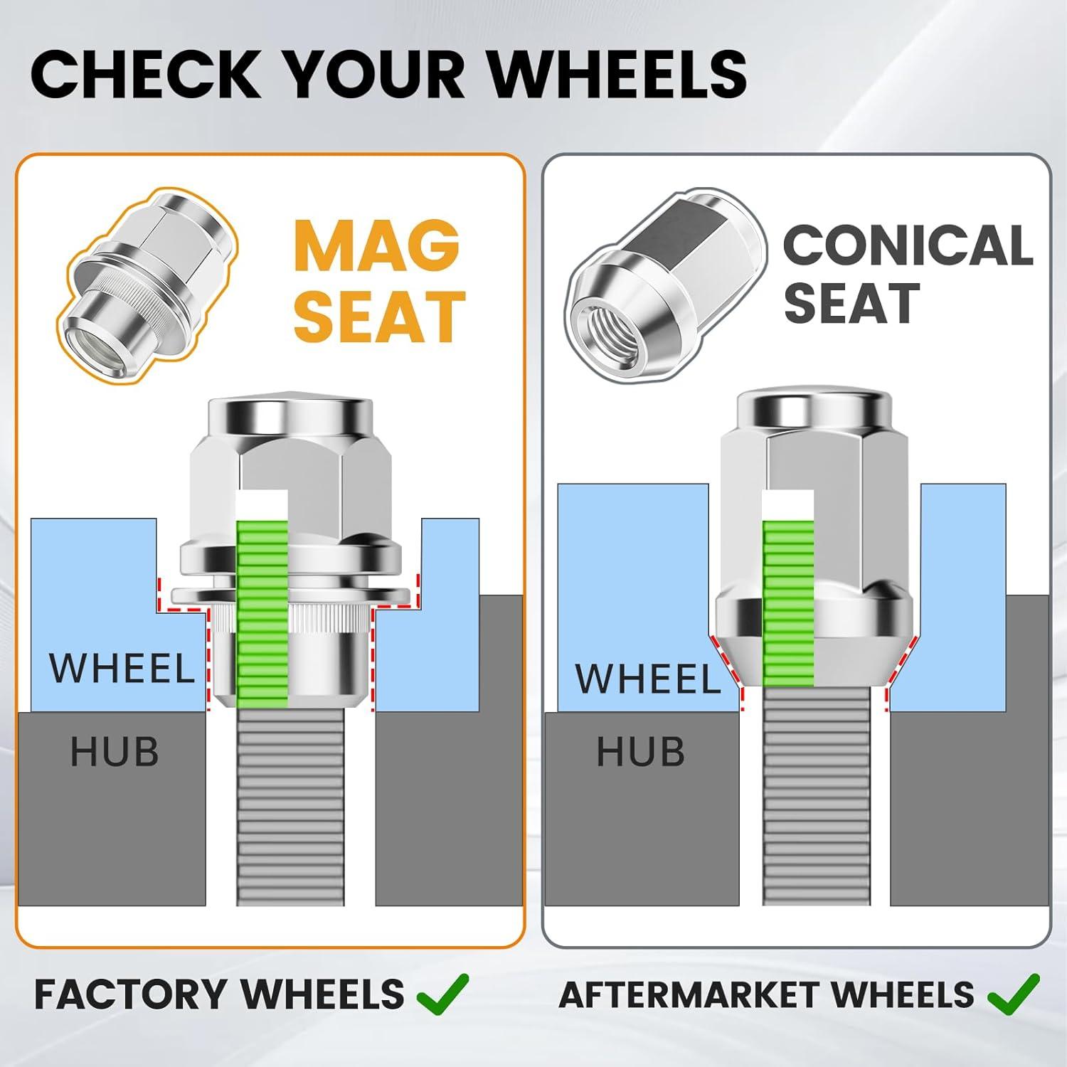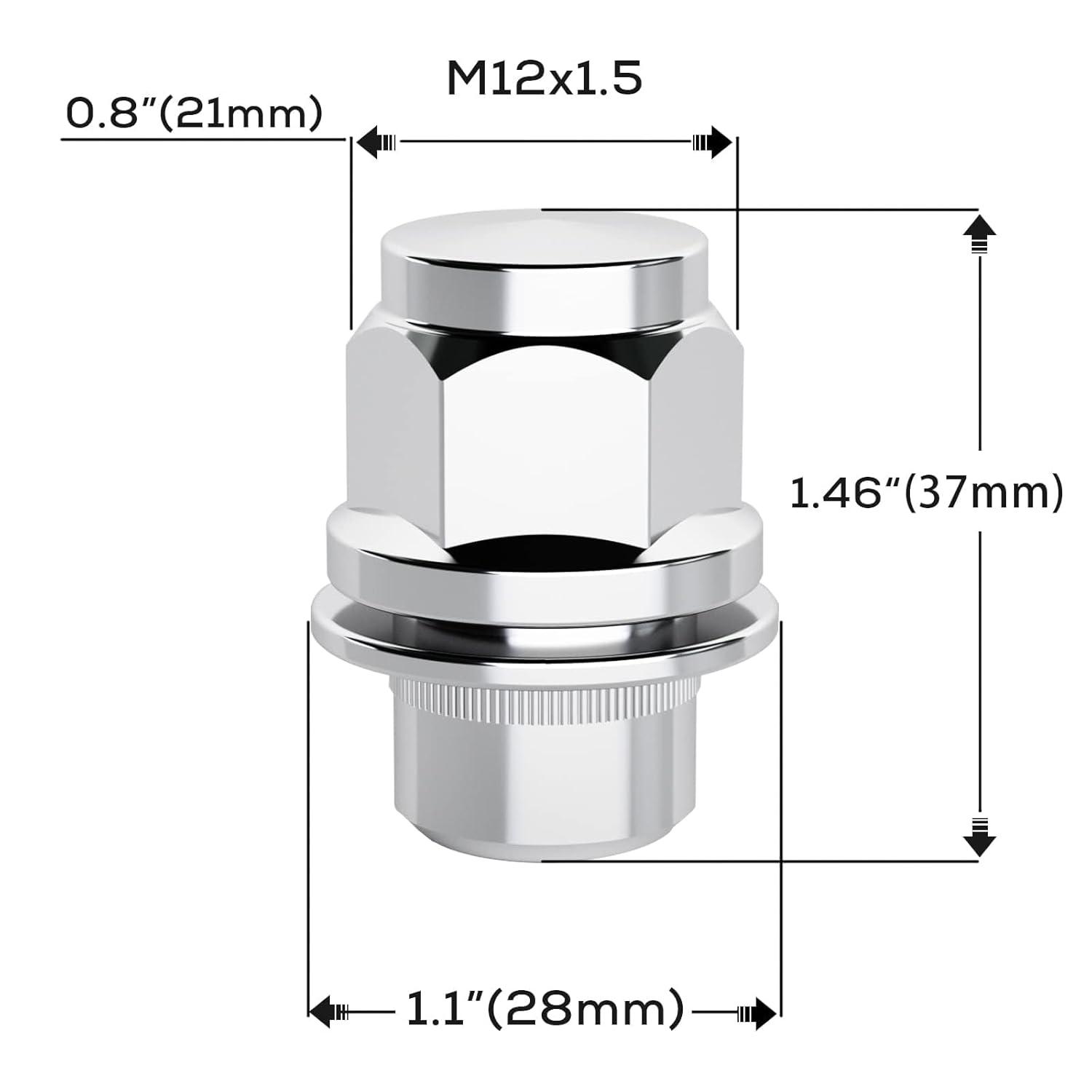 Specification: Thread pitch M12x1.5, Overall tall 1.46″ (37mm), Width 1.2″(30mm) , 20 packs Closed End Lug Nuts, 13/16″(21mm)Hex. Please note carefully it's not fit for vehicles with 60 degree conical seat (also known as cone seat/tapered seat), Ball Seat/Round Seat, Usually aftermarket wheel.