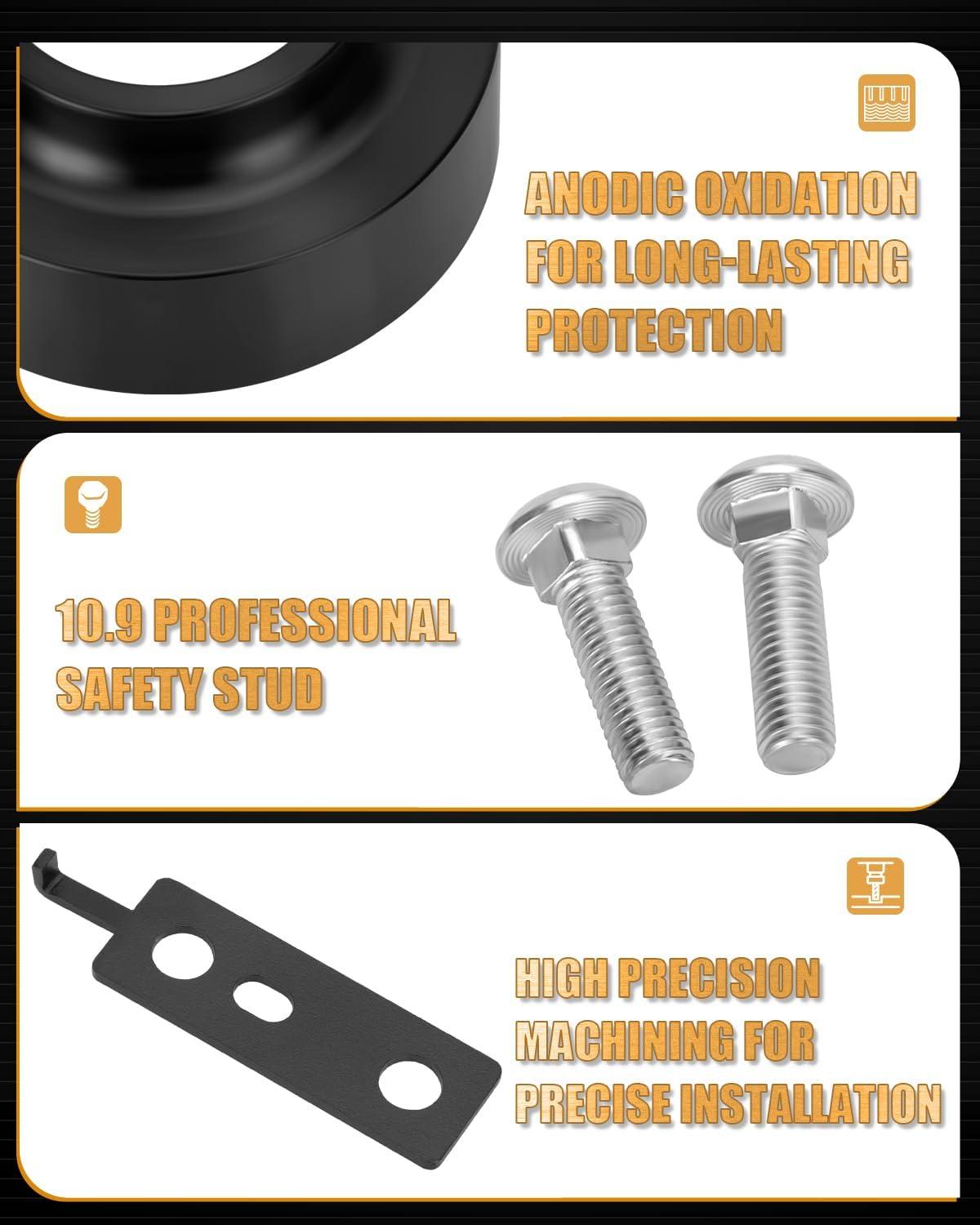 【Premium Material】Front strut top mount spacers fabricated from heavy-duty Carbon Steel, excellent resistance to corrosion by powder coat finish. The rear is lifted with forged aircraft billet aluminum T6 treated, CNC automatic processing, surface anodic oxidation, not only ensure high precision and stability, but also enhance the hardness