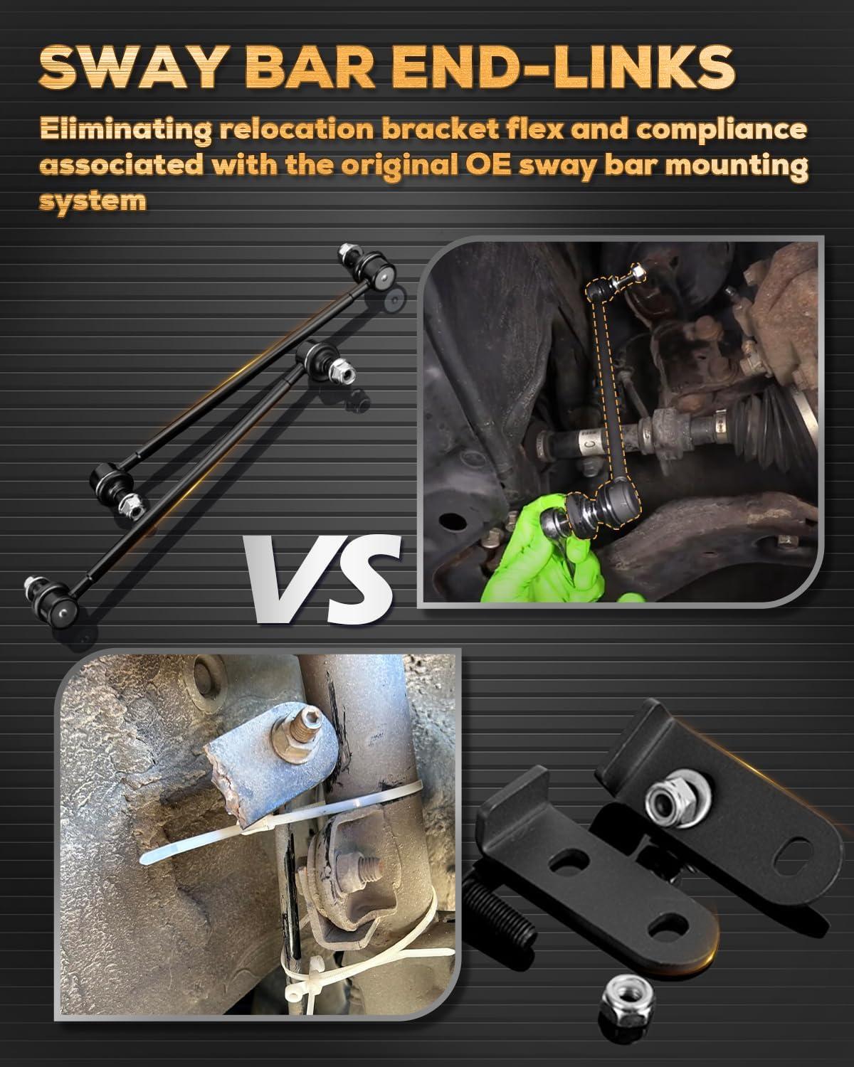 【Upgraded Sway Bar End-Links】dynofit proudly introduces this new lift Kits with upgraded sway bar end-links eliminating relocation bracket flex and compliance associated with the original OE sway bar mounting system. The all-new upgraded drop links are engineered for precise fitment, increase sway bar effectiveness, and maintain suspension geometry and ride & handling performance